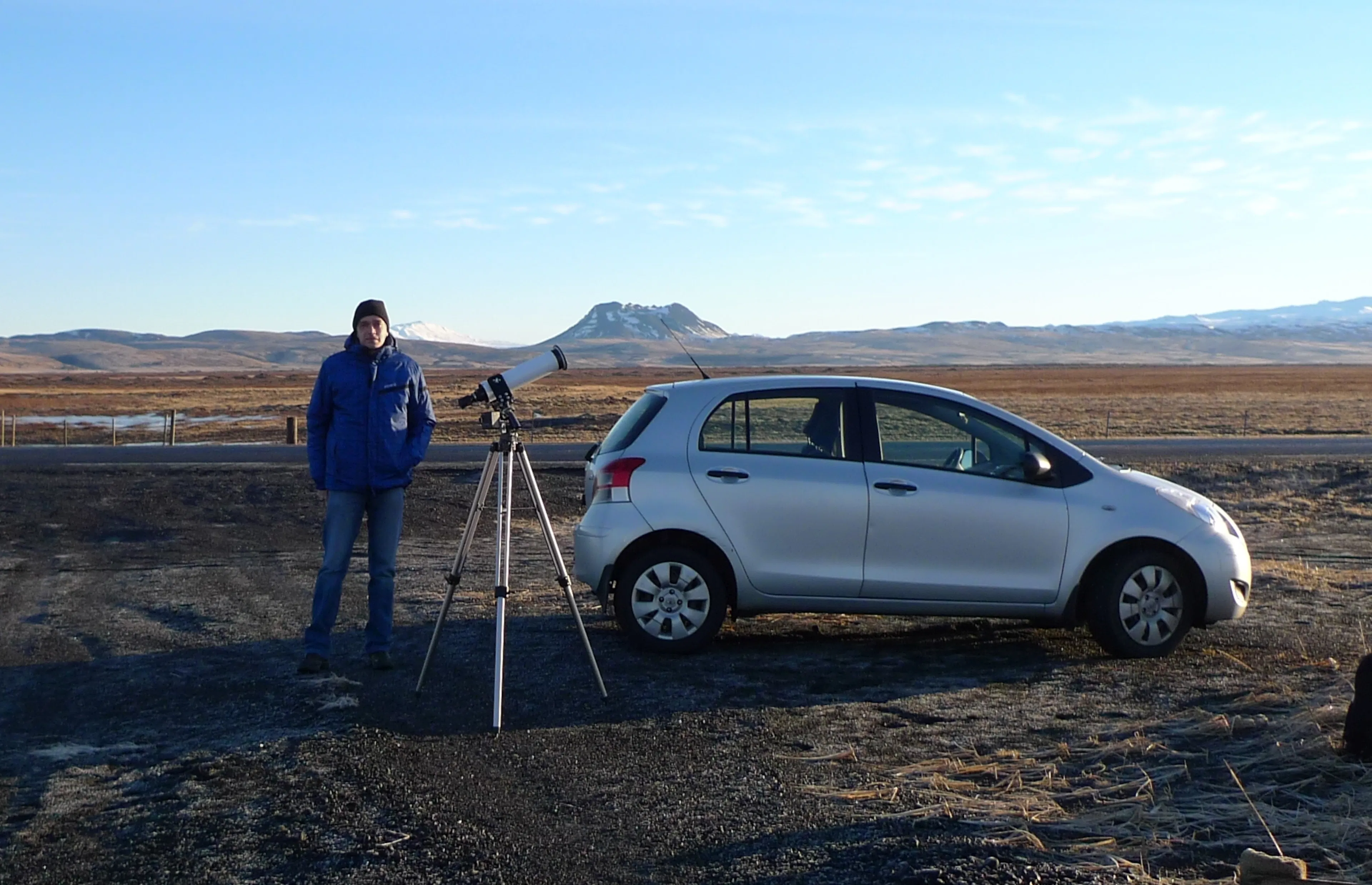 Ég kom kvöldið fyrir myrkvann og ferðin gæti varla hafa byrjað betur. Þegar ég ók frá Keflavík til Selfoss gerði þykka þoku en á Hellisheiði létti til og himinninn varð grænn þökk sé kröftugum segulstormi. Það voru mín fyrstu norðurljós. Ég kom til Selfoss, svaf í þrjá tíma og ætlaði að aka áfram til Hafnar sem var punkturinn næst almyrkvanum. Þegar ég ók af stað varð mér fjótt ljóst að ég yrði mjög ánægður með 98% deildarmyrkv svo ég nam staðar við Eyjafjallajökul, setti upp sjónauka og beið eftir fyrstu snertingu, þegar deildarmyrkvinn hæfist. Fólk stoppaði meira að segja hjá mér og fékk að kíkja í sjónaukann.