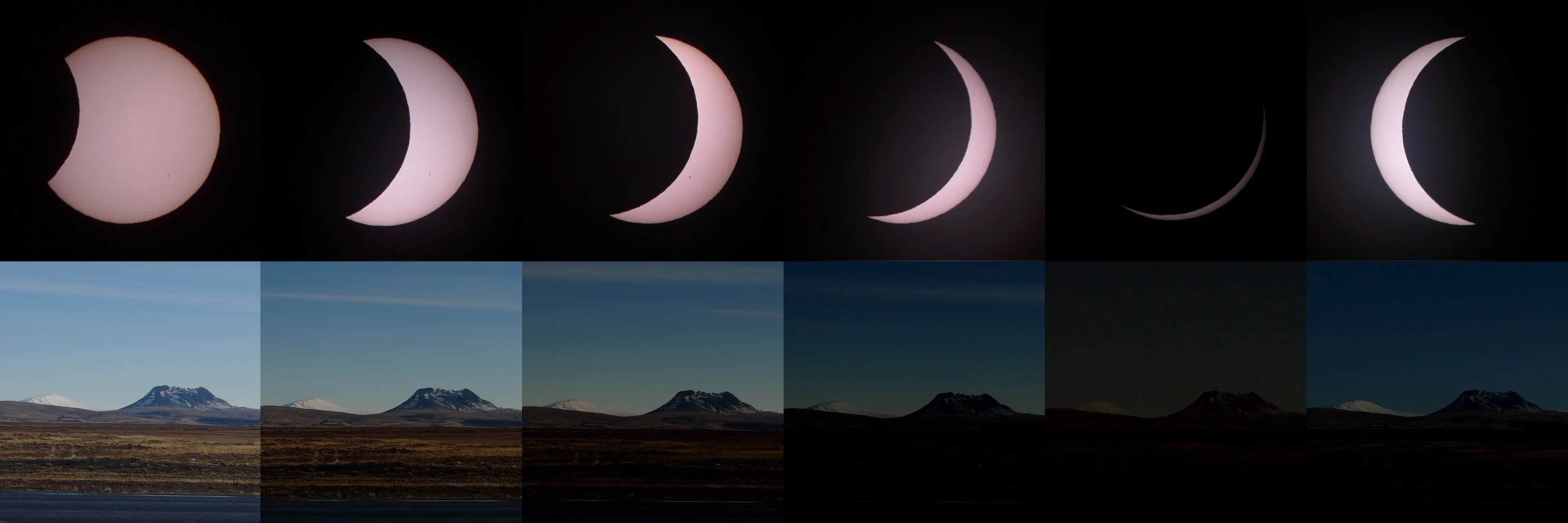 Ég fylgdist með myrkvanum öllum og varð vitni að tilþrifamiklum breytingum á birtunni. Einu vonbrigðin voru að mig langaði að reyna að sjá kórónu sólar með því að skyggj á þau 2% sólar sem eftir voru en háskýjaslæða byrgði sýn.